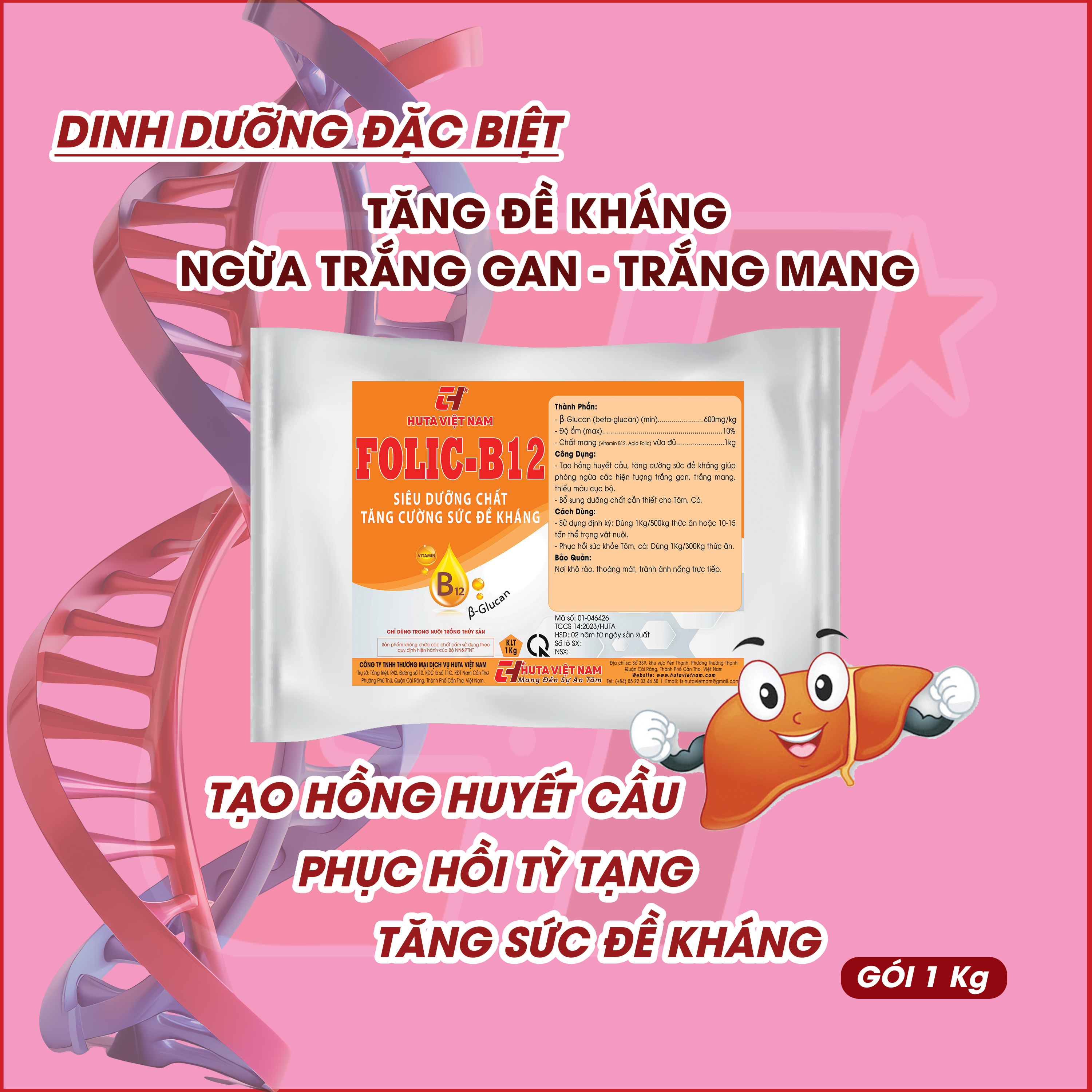 - Phục hồi sức khỏe Tôm, cá: 1Kg/300Kg thức ăn